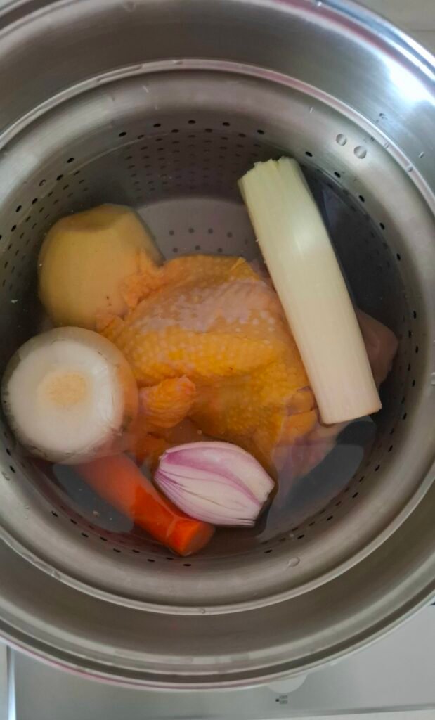 3.Mettete il pollo insieme a tutte le verdure in una pentola molto capiente. Aggiungete acqua fredda ( circa 3 litri) e una manciata di sale grosso. Posizionate la padella sul gas a fuoco alto per circa 10 min.