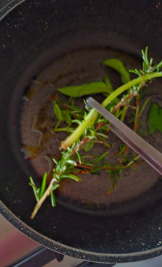 5.Terminata la marinatura preparate una padella antiaderente, aggiungete olio extravergine d’oliva e le erbe aromatiche recuperate dalla marinatura.