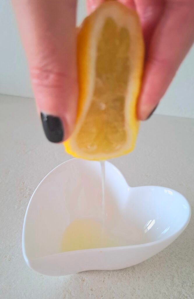 1.Spremete circa 2 cucchiai di succo di limone in una piccola terrina. Io preferisco spremere il limone direttamente con le mani, per praticità; in alternativa potete usare uno spremiagrumi per filtrare perfettamente il succo.